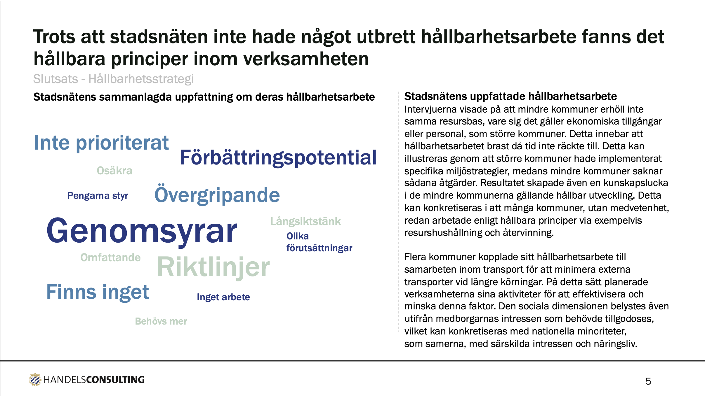 Hållbart företagande handlar om att på ett effektivt sätt kombinera ekonomiska aspekter med såväl sociala som miljömässiga. Hållbarhet har blivit en nästintill kritisk del i arbetet för företag och organisationer i takt med att krav från olika intressentgrupper ökar. Med de senaste akademiska kunskaperna inom hållbarhet hjälper HandelsConsulting olika verksamheter att säkerställa ett hållbart arbetssätt som genererar